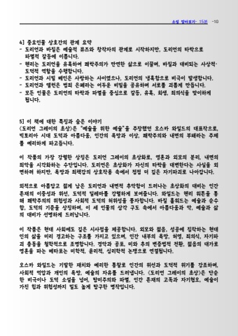 %uc18c%uc124 %uc54c%uc544%ubcf4%uae30- 15%ubd84-104] %uc911%uc694%uc778%ubb3c %uc0c1%ud638%uac04%uc758 %uad00%uacc4 %uc694%uc57d- %ub3c4%ub9ac%uc5b8%uacfc %ubc14%uc9c8%uc740 %uc608%uc220%uc801 %ubba4%uc988%uc640 %ucc3d%uc791%uc790%uc758 %uad00%uacc4%ub85c %uc2dc%uc791%ud558%uc9c0%ub9cc, %ub3c4%ub9ac%uc5b8%uc758 %ud0c0%ub77d%uc73c%ub85c %ud30c%uba78%uc801 %uac08%ub4f1%uc5d0 %uc774%ub985%ub2c8%ub2e4.- %ud5e8%ub9ac%ub294 %ub3c4%ub9ac%uc5b8%uc744 %uc720%ud639%ud558%uc5ec %ucf8c%ub77d%uc8fc%uc758%uac00 %ub9cc%uc5f0%ud55c %uc0b6%uc73c%ub85c %uc774%ub04c%uba70, %ubc14%uc9c8%uacfc %ub300%ube44%ub418%ub294 %uc0ac%uc0c1%uc801%u00b7%ub3c4%ub355%uc801 %uc5ed%ud560%uc744 %uc218%ud589%ud569%ub2c8%ub2e4.- %ub3c4%ub9ac%uc5b8%uacfc %uc2dc%ube4c %ubca0%uc778%uc740 %uc0ac%ub791%ud558%ub294 %uc0ac%uc774%uc600%uc73c%ub098, %ub3c4%ub9ac%uc5b8%uc758 %ub0c9%ud639%ud568%uc73c%ub85c %ube44%uadf9%uc774 %ubc1c%uc0dd%ud569%ub2c8%ub2e4.- %ub3c4%ub9ac%uc5b8%uacfc %uc568%ub7f0%uc740 %ubc94%uc8c4 %uc740%ud3d0%ub77c%ub294 %uc5b4%ub450%uc6b4 %ube44%ubc00%uc744 %uacf5%uc720%ud558%uba70 %uc11c%ub85c%ub97c %uad34%ub86d%uac8c %ub9cc%ub4ed%ub2c8%ub2e4.- %ubaa8%ub4e0 %uc778%ubb3c%uc740 %ub3c4%ub9ac%uc5b8%uc758 %ud0c0%ub77d%uacfc %ud30c%uba78%uc744 %uc911%uc2ec%uc73c%ub85c %uac08%ub4f1, %uc720%ud639, %ud76c%uc0dd, %uc8c4%uc758%uc2dd%uc744 %ub9de%uc774%ud558%uac8c %ub429%ub2c8%ub2e4.5] %uc774 %ucc45%uc5d0 %ub300%ud55c %ud2b9%uc9d5%uacfc %uc228%uc740 %uc774%uc57c%uae30%u300a%ub3c4%ub9ac%uc5b8 %uadf8%ub808%uc774%uc758 %ucd08%uc0c1%u300b%uc740 %u201c%uc608%uc220%uc744 %uc704%ud55c %uc608%uc220%u201d%uc744 %uc8fc%uc7a5%ud588%ub358 %uc624%uc2a4%uce74 %uc640%uc77c%ub4dc%uc758 %ub300%ud45c%uc791%uc73c%ub85c, %ube45%ud1a0%ub9ac%uc544 %uc2dc%ub300 %ub3c4%ub355%uacfc %uc544%ub984%ub2e4%uc6c0, %uc778%uac04%uc758 %uc695%ub9dd%uacfc %uc774%uc0c1, %ucf8c%ub77d%uc8fc%uc758%uc640 %ub0b4%uba74%uc758 %ubd80%ud328%ub77c%ub294 %uc8fc%uc81c%ub97c %uc608%ub9ac%ud558%uac8c %ud30c%uace0%ub4ed%ub2c8%ub2e4. %uc774 %uc791%ud488%uc758 %uac00%uc7a5 %uac15%ub82c%ud55c %uc0c1%uc9d5%uc740 %ub3c4%ub9ac%uc5b8 %uadf8%ub808%uc774%uc758 %ucd08%uc0c1%ud654%ub85c, %uc601%ud63c%uacfc %uc678%ubaa8%uc758 %ubd84%ub9ac, %ub0b4%uba74%uc758 %uc8c4%uc545%uc744 %uc2dc%uac01%ud654%ud558%ub294 %uc218%ub2e8%uc785%ub2c8%ub2e4. %ub3c4%ub9ac%uc5b8%uc740 %ucd08%uc0c1%ud654%uac00 %uc790%uc2e0%uc758 %ud0c0%ub77d%uc744 %ub300%ubcc0%ud55c%ub2e4%ub294 %uc0ac%uc2e4%uc744 %uc678%uba74%ud558%ub824 %ud558%uc9c0%ub9cc, %uc695%ub9dd%uacfc %uc8c4%ucc45%uac10%uc758 %uc0c1%ud638%uc791%uc6a9 %uc18d%uc5d0%uc11c %uc810%uc810 %ub354 %uae4a%uc740 %uc790%uae30%ud30c%uad34%ub85c %ub098%uc544%uac11%ub2c8%ub2e4.%uc678%uc801%uc73c%ub85c %uc544%ub984%ub2f5%uace0 %uc80a%uac8c %ub0a8%uc740 %ub3c4%ub9ac%uc5b8%uacfc %ub0b4%uba74%uc801 %ucd94%uc545%ud568%uc774 %ub4dc%ub7ec%ub098%ub294 %ucd08%uc0c1%ud654%uc758 %ub300%ube44%ub294 %uc778%uac04 %uc874%uc7ac%uc758 %uc774%uc911%uc131%uacfc %uc704%uc120, %ub3c4%ub355%uc801 %ub51c%ub808%ub9c8%ub97c %uac15%ub82c%ud558%uac8c %ubcf4%uc5ec%uc90d%ub2c8%ub2e4. %uc640%uc77c%ub4dc%ub294 %ud5e8%ub9ac %uc6cc%ud2bc%uc744 %ud1b5%ud574 %ucf8c%ub77d%uc8fc%uc758%uc758 %uc704%ud5d8%uc131%uacfc %uc0ac%ud68c%uc801 %ub3c4%ub355%uc758 %ud5c8%uc704%uc131%uc744 %ud48d%uc790%ud569%ub2c8%ub2e4. %ubc14%uc9c8 %ud640%uc6cc%ub4dc%ub294 %uc608%uc220%uacfc %uc21c%uc218%ud568, %ub3c4%ub355%uc758 %uae30%uc900%uc744 %uc0c1%uc9d5%ud558%uba70, %uc774 %uc138 %uc778%ubb3c%uc758 %uc0bc%uac01 %uad6c%ub3c4 %uc18d%uc5d0%uc11c %uc544%ub984%ub2e4%uc6c0%uacfc %uc545, %uc608%uc220%uacfc %uc0b6%uc758 %ub300%ube44%uac00 %uc120%uba85%ud558%uac8c %ub4dc%ub7ec%ub0a9%ub2c8%ub2e4.%uc774 %uc791%ud488%uc740 %ud604%ub300 %uc0ac%ud68c%uc5d0%ub3c4 %uae4a%uc740 %uc2dc%uc0ac%uc810%uc744 %uc81c%uacf5%ud569%ub2c8%ub2e4. %uc678%ubaa8%uc640 %uc80a%uc74c, %uc131%uacf5%uc5d0 %uc9d1%ucc29%ud558%ub294 %ud604%ub300%uc778%uc758 %uc0b6%uc744 %ubbf8%ub9ac %uacbd%uace0%ud558%ub294 %uad6c%uc870%ub97c %uac00%uc9c0%uace0 %uc788%uc73c%uba70, %uc778%uac04 %ub0b4%ubd80%uc758 %uc695%ub9dd, %ud5c8%uc601, %uc8c4%uc758%uc2dd, %uc790%uae30%ud30c%uad34 %ucda9%ub3d9%uc744 %ucca0%ud559%uc801%uc73c%ub85c %uc870%uba85%ud569%ub2c8%ub2e4. %uacbd%uc545%uacfc %uacf5%ud3ec, %ubbf8%uc640 %ucd94%uc758 %ubcc0%uc99d%ubc95%uc801 %uc804%ud658, %uc80a%uc74c%uc758 %ub300%uac00%ub85c %uc601%ud63c%uc744 %ud30c%ub294 %uba54%ud0c0%ud3ec%ub294 %ubbf8%ud559%uc801, %uc724%ub9ac%uc801, %uc2ec%ub9ac%ud559%uc801 %ub17c%uc7c1%uc73c%ub85c %uc5f0%uacb0%ub429%ub2c8%ub2e4.%uc624%uc2a4%uce74 %uc640%uc77c%ub4dc%ub294 %uae30%ubc1c%ud55c %uc7ac%uce58%uc640 %uc608%ub9ac%ud55c %ud1b5%ucc30%ub85c %uc778%uac04%uc758 %uc704%uc120%uacfc %ub3c4%ub355%uc801 %uc704%uae30%ub97c %uac15%uc870%ud558%uba70, %uc0ac%ud68c%uc801 %uc5b5%uc555%uacfc %uac1c%uc778%uc758 %uc695%ub9dd, %uc608%uc220%uc758 %uc790%uc720%ub97c %ub4dc%ub7ec%ub0c5%ub2c8%ub2e4. %u300a%ub3c4%ub9ac%uc5b8 %uadf8%ub808%uc774%uc758 %ucd08%uc0c1%u300b%uc740 %ub2e8%uc21c%ud55c %ube44%uadf9%uc774%ub098 %ub3c4%ub355 %uc18c%uc124%uc744 %ub118%uc5b4, %ud0d0%ubbf8%uc8fc%uc758%uc640 %ud30c%uba78, %uc778%uac04 %uc874%uc7ac%uc758 %uace0%ub3c5%uacfc %uc790%uae30%ud610%uc624, %uc608%uc220%uc774 %uac00%uc9c4 %ud798%uacfc %uc704%ud5d8%uc131%uae4c%uc9c0 %ubc00%ub3c4 %ub192%uac8c %ud0d0%uad6c%ud55c %uba85%uc791%uc785%ub2c8%ub2e4.