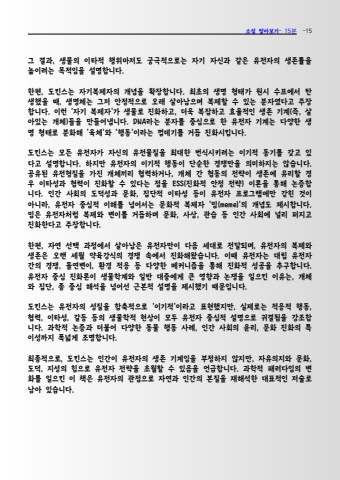 %uc18c%uc124 %uc54c%uc544%ubcf4%uae30- 15%ubd84-15%uadf8 %uacb0%uacfc, %uc0dd%ubb3c%uc758 %uc774%ud0c0%uc801 %ud589%uc704%ub9c8%uc800%ub3c4 %uad81%uadf9%uc801%uc73c%ub85c%ub294 %uc790%uae30 %uc790%uc2e0%uacfc %uac19%uc740 %uc720%uc804%uc790%uc758 %uc0dd%uc874%ub960%uc744 %ub192%uc774%ub824%ub294 %ubaa9%uc801%uc784%uc744 %uc124%uba85%ud569%ub2c8%ub2e4.%ud55c%ud3b8, %ub3c4%ud0a8%uc2a4%ub294 %uc790%uae30%ubcf5%uc81c%uc790%uc758 %uac1c%ub150%uc744 %ud655%uc7a5%ud569%ub2c8%ub2e4. %ucd5c%ucd08%uc758 %uc0dd%uba85 %ud615%ud0dc%uac00 %uc6d0%uc2dc %uc218%ud504%uc5d0%uc11c %ud0c4%uc0dd%ud588%uc744 %ub54c, %uc0dd%uba85%uccb4%ub294 %uadf8%uc800 %uc548%uc815%uc801%uc73c%ub85c %uc624%ub798 %uc0b4%uc544%ub0a8%uc73c%uba70 %ubcf5%uc81c%ud560 %uc218 %uc788%ub294 %ubd84%uc790%uc600%ub2e4%uace0 %uc8fc%uc7a5%ud569%ub2c8%ub2e4. %uc774%ub7f0 '%uc790%uae30 %ubcf5%uc81c%uc790'%uac00 %uc0dd%ubb3c%ub85c %uc9c4%ud654%ud558%uace0, %ub354%uc6b1 %ubcf5%uc7a1%ud558%uace0 %ud6a8%uc728%uc801%uc778 %uc0dd%uc874 %uae30%uacc4(%uc989, %uc0b4%uc544%uc788%ub294 %uac1c%uccb4)%ub4e4%uc744 %ub9cc%ub4e4%uc5b4%ub0c5%ub2c8%ub2e4. DNA%ub77c%ub294 %ubd84%uc790%ub97c %uc911%uc2ec%uc73c%ub85c %ud55c %uc720%uc804%uc790 %uae30%uacc4%ub294 %ub2e4%uc591%ud55c %uc0dd%uba85 %ud615%ud0dc%ub85c %ubd84%ud654%ud574 '%uc721%uccb4'%uc640 '%ud589%ub3d9'%uc774%ub77c%ub294 %uaecd%ub370%uae30%ub97c %uac70%ub4ed %uc9c4%ud654%uc2dc%ud0b5%ub2c8%ub2e4.%ub3c4%ud0a8%uc2a4%ub294 %ubaa8%ub4e0 %uc720%uc804%uc790%uac00 %uc790%uc2e0%uc758 %uc720%uc804%ubb3c%uc9c8%uc744 %ucd5c%ub300%ud55c %ubc88%uc2dd%uc2dc%ud0a4%ub824%ub294 %uc774%uae30%uc801 %ub3d9%uae30%ub97c %uac16%uace0 %uc788%ub2e4%uace0 %uc124%uba85%ud569%ub2c8%ub2e4. %ud558%uc9c0%ub9cc %uc720%uc804%uc790%uc758 %uc774%uae30%uc801 %ud589%ub3d9%uc774 %ub2e8%uc21c%ud55c %uacbd%uc7c1%ub9cc%uc744 %uc758%ubbf8%ud558%uc9c0%ub294 %uc54a%uc2b5%ub2c8%ub2e4. %uacf5%uc720%ub41c %uc720%uc804%ud615%uc9c8%uc744 %uac00%uc9c4 %uac1c%uccb4%ub07c%ub9ac %ud611%ub825%ud558%uac70%ub098, %uac1c%uccb4 %uac04 %ud611%ub3d9%uc758 %uc804%ub7b5%uc774 %uc0dd%uc874%uc5d0 %uc720%ub9ac%ud560 %uacbd%uc6b0 %uc774%ud0c0%uc131%uacfc %ud611%ub825%uc774 %uc9c4%ud654%ud560 %uc218 %uc788%ub2e4%ub294 %uc810%uc744 ESS(%uc9c4%ud654%uc801 %uc548%uc815 %uc804%ub7b5) %uc774%ub860%uc744 %ud1b5%ud574 %ub17c%uc99d%ud569%ub2c8%ub2e4. %uc778%uac04 %uc0ac%ud68c%uc758 %ub3c4%ub355%uc131%uacfc %ubb38%ud654, %uc9d1%ub2e8%uc801 %uc774%ud0c0%uc131 %ub4f1%uc774 %uc720%uc804%uc790 %ud504%ub85c%uadf8%ub7a8%uc5d0%ub9cc %uac07%ud78c %uac83%uc774 %uc544%ub2c8%ub77c, %uc720%uc804%uc790 %uc911%uc2ec%uc801 %uc774%ud574%ub97c %ub118%uc5b4%uc11c%ub294 %ubb38%ud654%uc801 %ubcf5%uc81c%uc790 '%ubc08(meme)'%uc758 %uac1c%ub150%ub3c4 %uc81c%uc2dc%ud569%ub2c8%ub2e4. %ubc08%uc740 %uc720%uc804%uc790%ucc98%ub7fc %ubcf5%uc81c%uc640 %ubcc0%uc774%ub97c %uac70%ub4ed%ud558%uba70 %ubb38%ud654, %uc0ac%uc0c1, %uad00%uc2b5 %ub4f1 %uc778%uac04 %uc0ac%ud68c%uc5d0 %ub110%ub9ac %ud37c%uc9c0%uace0 %uc9c4%ud654%ud55c%ub2e4%uace0 %uc8fc%uc7a5%ud569%ub2c8%ub2e4.%ud55c%ud3b8, %uc790%uc5f0 %uc120%ud0dd %uacfc%uc815%uc5d0%uc11c %uc0b4%uc544%ub0a8%uc740 %uc720%uc804%uc790%ub9cc%uc774 %ub2e4%uc74c %uc138%ub300%ub85c %uc804%ub2ec%ub418%uba70, %uc720%uc804%uc790%uc758 %ubcf5%uc81c%uc640 %uc0dd%uc874%uc740 %uc624%ub79c %uc138%uc6d4 %uc57d%uc721%uac15%uc2dd%uc758 %uacbd%uc7c1 %uc18d%uc5d0%uc11c %uc9c4%ud654%ud574%uc654%uc2b5%ub2c8%ub2e4. %uc774%ub54c %uc720%uc804%uc790%ub294 %ub300%ub9bd %uc720%uc804%uc790 %uac04%uc758 %uacbd%uc7c1, %ub3cc%uc5f0%ubcc0%uc774, %ud658%uacbd %uc801%uc751 %ub4f1 %ub2e4%uc591%ud55c %uba54%ucee4%ub2c8%uc998%uc744 %ud1b5%ud574 %uc9c4%ud654%uc801 %uc131%uacf5%uc744 %ucd94%uad6c%ud569%ub2c8%ub2e4. %uc720%uc804%uc790 %uc911%uc2ec %uc9c4%ud654%ub860%uc774 %uc0dd%ubb3c%ud559%uacc4%uc640 %uc77c%ubc18 %ub300%uc911%uc5d0%uac8c %ud070 %uc601%ud5a5%uacfc %ub17c%uc7c1%uc744 %uc77c%uc73c%ud0a8 %uc774%uc720%ub294, %uac1c%uccb4%uc640 %uc9d1%ub2e8, %uc885 %uc911%uc2ec %ud574%uc11d%uc744 %ub118%uc5b4%uc120 %uadfc%ubcf8%uc801 %uc124%uba85%uc744 %uc81c%uc2dc%ud588%uae30 %ub54c%ubb38%uc785%ub2c8%ub2e4.%ub3c4%ud0a8%uc2a4%ub294 %uc720%uc804%uc790%uc758 %uc131%uc9c8%uc744 %ud568%ucd95%uc801%uc73c%ub85c '%uc774%uae30%uc801'%uc774%ub77c%uace0 %ud45c%ud604%ud588%uc9c0%ub9cc, %uc2e4%uc81c%ub85c%ub294 %uc801%uc751%uc801 %ud589%ub3d9, %ud611%ub825, %uc774%ud0c0%uc131, %uac08%ub4f1 %ub4f1%uc758 %uc0dd%ubb3c%ud559%uc801 %ud604%uc0c1%uc774 %ubaa8%ub450 %uc720%uc804%uc790 %uc911%uc2ec%uc801 %uc124%uba85%uc73c%ub85c %uadc0%uacb0%ub428%uc744 %uac15%uc870%ud569%ub2c8%ub2e4. %uacfc%ud559%uc801 %ub17c%uc99d%uacfc %ub354%ubd88%uc5b4 %ub2e4%uc591%ud55c %ub3d9%ubb3c %ud589%ub3d9 %uc0ac%ub840, %uc778%uac04 %uc0ac%ud68c%uc758 %uc724%ub9ac, %ubb38%ud654 %uc9c4%ud654%uc758 %ud2b9%uc774%uc131%uae4c%uc9c0 %ud3ed%ub113%uac8c %uc870%uba85%ud569%ub2c8%ub2e4.%ucd5c%uc885%uc801%uc73c%ub85c, %ub3c4%ud0a8%uc2a4%ub294 %uc778%uac04%uc774 %uc720%uc804%uc790%uc758 %uc0dd%uc874 %uae30%uacc4%uc784%uc744 %ubd80%uc815%ud558%uc9c0 %uc54a%uc9c0%ub9cc, %uc790%uc720%uc758%uc9c0%uc640 %ubb38%ud654, %ub3c4%ub355, %uc9c0%uc131%uc758 %ud798%uc73c%ub85c %uc720%uc804%uc790 %uc804%ub7b5%uc744 %ucd08%uc6d4%ud560 %uc218 %uc788%uc74c%uc744 %uc5b8%uae09%ud569%ub2c8%ub2e4. %uacfc%ud559%uc801 %ud328%ub7ec%ub2e4%uc784%uc758 %ubcc0%ud654%ub97c %uc77c%uc73c%ud0a8 %uc774 %ucc45%uc740 %uc720%uc804%uc790%uc758 %uad00%uc810%uc73c%ub85c %uc790%uc5f0%uacfc %uc778%uac04%uc758 %ubcf8%uc9c8%uc744 %uc7ac%ud574%uc11d%ud55c %ub300%ud45c%uc801%uc778 %uc800%uc220%ub85c %ub0a8%uc544 %uc788%uc2b5%ub2c8%ub2e4.