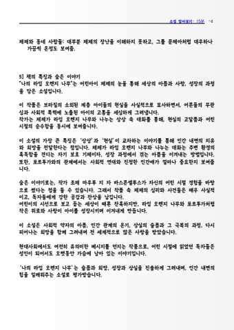 %uc18c%uc124 %uc54c%uc544%ubcf4%uae30- 15%ubd84-4%uc81c%uc81c%uc640 %ub3d9%ub124 %uc0ac%ub78c%ub4e4: %ub300%ubd80%ubd84 %uc81c%uc81c%uc758 %uc7a5%ub09c%uc744 %uc774%ud574%ud558%uc9c0 %ubabb%ud558%uace0, %uadf8%ub97c %ubb38%uc81c%uc544%ucc98%ub7fc %ub300%uc6b0%ud558%ub098 %uac00%ub054%uc529 %uc628%uc815%ub3c4 %ubcf4%uc5ec%uc90c.5] %ucc45%uc758 %ud2b9%uc9d5%uacfc %uc228%uc740 %uc774%uc57c%uae30 \ %ub77c%uc784 %uc624%ub80c%uc9c0 %ub098%ubb34\%uc744 %ub2f4%uc740 %uc18c%uc124%uc785%ub2c8%ub2e4. %uc774 %uc791%ud488%uc740 %ube0c%ub77c%uc9c8%uc758 %uc18c%uc678%ub41c %uacc4%uce35 %uc544%uc774%ub4e4%uc758 %ud604%uc2e4%uc744 %uc0ac%uc2e4%uc801%uc73c%ub85c %ubb18%uc0ac%ud558%uba74%uc11c, %uc5b4%ub978%ub4e4%uc758 %ubb34%uad00%uc2ec%uacfc %uc0ac%ud68c%uc801 %ud3ed%ub825%uc5d0 %ub178%ucd9c%ub41c %uc544%uc774%uc758 %uace0%ud1b5%uc744 %uc138%uc2ec%ud558%uac8c %uadf8%ub824%ub0c5%ub2c8%ub2e4. %uc791%uac00%ub294 %uc81c%uc81c%uac00 %ub77c%uc784 %uc624%ub80c%uc9c0 %ub098%ubb34%uc640 %ub098%ub204%ub294 %uc0c1%uc0c1 %uc18d %ub300%ud654%ub97c %ud1b5%ud574, %ud604%uc2e4%uc758 %uace0%ub2ec%ud514%uacfc %uc5b4%ub9b0 %uc2dc%uc808%uc758 %uc21c%uc218%ud568%uc744 %ub3d9%uc2dc%uc5d0 %ubcf4%uc5ec%uc90d%ub2c8%ub2e4.%uc774 %uc18c%uc124%uc758 %uac00%uc7a5 %ud070 %ud2b9%uc9d5%uc740 %u2018%uc0c1%uc0c1%u2019%uacfc %u2018%ud604%uc2e4%u2019%uc774 %uad50%ucc28%ud558%ub294 %uc774%uc57c%uae30%ub97c %ud1b5%ud574 %uc778%uac04 %ub0b4%uba74%uc758 %uce58%uc720%uc640 %ud76c%ub9dd%uc744 %uc804%ub2ec%ud55c%ub2e4%ub294 %uc810%uc785%ub2c8%ub2e4. %uc81c%uc81c%uac00 %ub77c%uc784 %uc624%ub80c%uc9c0 %ub098%ubb34%uc640 %ub098%ub204%ub294 %ub300%ud654%ub294 %uc8fc%ubcc0 %ud658%uacbd%uc758 %ud639%ub3c5%ud568%uc744 %uacac%ub514%ub294 %uc790%uae30 %ubcf4%ud638 %uae30%uc81c%uc774%uc790, %uc131%uc7a5 %uacfc%uc815%uc5d0%uc11c %uacaa%ub294 %uc544%ud514%uc744 %uc774%uaca8%ub0b4%ub294 %ubc29%ubc95%uc785%ub2c8%ub2e4. %ub610%ud55c, %ud3ec%ub974%ud22c%uac00%uc640%uc758 %uad00%uacc4%uc5d0%uc11c%ub294 %uc0ac%ud68c%uc801 %uc5f0%ub300%uc640 %uc9c4%uc815%ud55c %uc778%uac04%uc560%uac00 %uc5bc%ub9c8%ub098 %uc911%uc694%ud55c%uc9c0 %ubcf4%uc5ec%uc90d%ub2c8%ub2e4.%uc228%uc740 %uc774%uc57c%uae30%ub85c%ub294, %uc791%uac00 %uc870%uc81c %ub9c8%uc6b0%ub8e8 %uc9c0 %uc790 %ubc14%uc2a4%ucf58%uc140%ub8e8%uc2a4%uac00 %uc790%uc2e0%uc758 %uc5b4%ub9b0 %uc2dc%uc808 %uacbd%ud5d8%uc744 %ubc14%ud0d5%uc73c%ub85c %uc37c%ub2e4%ub294 %uc810%uc744 %ub4e4 %uc218 %uc788%uc2b5%ub2c8%ub2e4. %uadf8%ub798%uc11c %uc791%ud488 %uc18d %uc81c%uc81c%uc758 %uc2ec%ub9ac%uc640 %uc0ac%uac74%ub4e4%uc740 %ub9e4%uc6b0 %uc0ac%uc2e4%uc801%uc774%uace0, %ub3c5%uc790%ub4e4%uc5d0%uac8c %uac15%ud55c %uacf5%uac10%uacfc %uc794%uc0c1%uc744 %ub0a8%uae41%ub2c8%ub2e4. %uc5b4%ub9b0%uc774%uc758 %uc2dc%uc120%uc73c%ub85c %ubcf4%uace0 %ub4e3%ub294 %uc138%uc0c1%uc774 %ub54c%ub860 %uc794%ud639%ud558%uc9c0%ub9cc, %ub77c%uc784 %uc624%ub80c%uc9c0 %ub098%ubb34%uc640 %ud3ec%ub974%ud22c%uac00%ucc98%ub7fc %uc791%uc740 %uc704%ub85c%uc640 %uc0ac%ub791%uc774 %uc544%uc774%ub97c %uc131%uc7a5%uc2dc%ud0a4%uba70 %uc774%uaca8%ub0b4%uac8c %ub9cc%ub4ed%ub2c8%ub2e4.%uc774 %uc18c%uc124%uc740 %uc0ac%ud68c%uc801 %uc57d%uc790%uc758 %uc544%ud514, %uc778%uac04 %uad00%uacc4%uc758 %uc628%uae30, %uc0c1%uc2e4%uc758 %uc2ac%ud514%uacfc %uadf8 %uadf9%ubcf5%uc758 %uacfc%uc815, %ub2e4%uc2dc %ud53c%uc5b4%ub098%ub294 %ud76c%ub9dd%uc744 %ud568%uaed8 %uadf8%ub824%ub0b4%uba70 %uc804 %uc138%uacc4%uc801%uc73c%ub85c %ub9ce%uc740 %uc0ac%ub791%uc744 %ubc1b%uc558%uc2b5%ub2c8%ub2e4. %ud604%ub300%uc0ac%ud68c%uc5d0%uc11c%ub3c4 %uc5ec%uc804%ud788 %uc720%uc758%ubbf8%ud55c %uba54%uc2dc%uc9c0%ub97c %ub358%uc9c0%ub294 %uc791%ud488%uc73c%ub85c, %uc5b4%ub9b0 %uc2dc%uc808%uc5d0 %uc77d%uc5c8%ub358 %ub3c5%uc790%ub4e4%uc740 %uc131%uc778%uc774 %ub418%uc5b4%uc11c%ub3c4 %uc624%ub7ab%ub3d9%uc548 %uac00%uc2b4%uc5d0 %ub0a8%uc544 %uc788%ub294 %uc774%uc57c%uae30%uc785%ub2c8%ub2e4. %u2018%ub098%uc758 %ub77c%uc784 %uc624%ub80c%uc9c0 %ub098%ubb34%u2019%ub294 %uc2ac%ud514%uacfc %ud76c%ub9dd, %uc131%uc7a5%uacfc %uc0c1%uc2e4%uc744 %uc9c4%uc194%ud558%uac8c %uadf8%ub824%ub0b4%uba70, %uc778%uac04 %ub0b4%uba74%uc758 %ud798%uc744 %uc77c%uae68%uc6cc%uc8fc%ub294 %uc18c%uc124%ub85c %ud3c9%uac00%ubc1b%uc2b5%ub2c8%ub2e4.