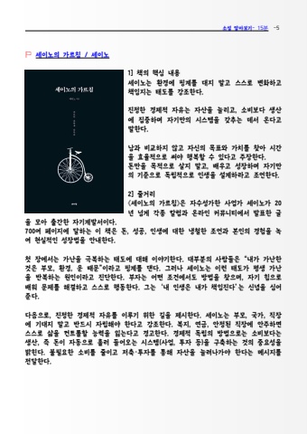 %uc18c%uc124 %uc54c%uc544%ubcf4%uae30- 15%ubd84-5%u2690 %uc138%uc774%ub178%uc758 %uac00%ub974%uce68 / %uc138%uc774%ub1781] %ucc45%uc758 %ud575%uc2ec %ub0b4%uc6a9 %uc138%uc774%ub178%ub294 %ud658%uacbd%uc5d0 %ud551%uacc4%ub97c %ub300%uc9c0 %ub9d0%uace0 %uc2a4%uc2a4%ub85c %ubcc0%ud654%ud558%uace0 %ucc45%uc784%uc9c0%ub294 %ud0dc%ub3c4%ub97c %uac15%uc870%ud55c%ub2e4.%uc9c4%uc815%ud55c %uacbd%uc81c%uc801 %uc790%uc720%ub294 %uc790%uc0b0%uc744 %ub298%ub9ac%uace0, %uc18c%ube44%ubcf4%ub2e4 %uc0dd%uc0b0%uc5d0 %uc9d1%uc911%ud558%uba70 %uc790%uae30%ub9cc%uc758 %uc2dc%uc2a4%ud15c%uc744 %uac16%ucd94%ub294 %ub370%uc11c %uc628%ub2e4%uace0 %ub9d0%ud55c%ub2e4.%ub0a8%uacfc %ube44%uad50%ud558%uc9c0 %uc54a%uace0 %uc790%uc2e0%uc758 %ubaa9%ud45c%uc640 %uac00%uce58%ub97c %ucc3e%uc544 %uc2dc%uac04%uc744 %ud6a8%uc728%uc801%uc73c%ub85c %uc368%uc57c %ud589%ubcf5%ud560 %uc218 %uc788%ub2e4%uace0 %uc8fc%uc7a5%ud55c%ub2e4.%ub3c8%ub9cc%uc744 %ubaa9%uc801%uc73c%ub85c %uc0b4%uc9c0 %ub9d0%uace0, %ubc30%uc6b0%uace0 %uc131%uc7a5%ud558%uba70 %uc790%uae30%ub9cc%uc758 %uae30%uc900%uc73c%ub85c %ub3c5%ub9bd%uc801%uc73c%ub85c %uc778%uc0dd%uc744 %uc124%uacc4%ud558%ub77c%uace0 %uc870%uc5b8%ud55c%ub2e4.2] %uc904%uac70%ub9ac %u300a%uc138%uc774%ub178%uc758 %uac00%ub974%uce68%u300b%uc740 %uc790%uc218%uc131%uac00%ud55c %uc0ac%uc5c5%uac00 %uc138%uc774%ub178%uac00 20%ub144 %ub118%uac8c %uac01%uc885 %uce7c%ub7fc%uacfc %uc628%ub77c%uc778 %ucee4%ubba4%ub2c8%ud2f0%uc5d0%uc11c %ubc1c%ud45c%ud55c %uae00%uc744 %ubaa8%uc544 %ucd9c%uac04%ud55c %uc790%uae30%uacc4%ubc1c%uc11c%uc774%ub2e4. 700%uc5ec %ud398%uc774%uc9c0%uc5d0 %ub2ec%ud558%ub294 %uc774 %ucc45%uc740 %ub3c8, %uc131%uacf5, %uc778%uc0dd%uc5d0 %ub300%ud55c %ub0c9%ucca0%ud55c %uc870%uc5b8%uacfc %ubcf8%uc778%uc758 %uacbd%ud5d8%uc744 %ub179%uc5ec %ud604%uc2e4%uc801%uc778 %uc131%uc7a5%ubc95%uc744 %uc548%ub0b4%ud55c%ub2e4.%uccab %uc7a5%uc5d0%uc11c%ub294 %uac00%ub09c%uc744 %uadf9%ubcf5%ud558%ub294 %ud0dc%ub3c4%uc5d0 %ub300%ud574 %uc774%uc57c%uae30%ud55c%ub2e4. %ub300%ubd80%ubd84%uc758 %uc0ac%ub78c%ub4e4%uc740 %u201c%ub0b4%uac00 %uac00%ub09c%ud55c %uac83%uc740 %ubd80%ubaa8, %ud658%uacbd, %uc6b4 %ub54c%ubb38%u201d%uc774%ub77c%uace0 %ud551%uacc4%ub97c %ub304%ub2e4. %uadf8%ub7ec%ub098 %uc138%uc774%ub178%ub294 %uc774%ub7f0 %ud0dc%ub3c4%uac00 %ud3c9%uc0dd %uac00%ub09c%uc744 %ubc18%ubcf5%ud558%ub294 %uc6d0%uc778%uc774%ub77c%uace0 %uc9c4%ub2e8%ud55c%ub2e4. %ubd80%uc790%ub294 %uc5b4%ub5a4 %uc870%uac74%uc5d0%uc11c%ub3c4 %ubc29%ubc95%uc744 %ucc3e%uc73c%uba70, %uc790%uae30 %ud798%uc73c%ub85c %ubc30%uc6cc %ubb38%uc81c%ub97c %ud574%uacb0%ud558%uace0 %uc2a4%uc2a4%ub85c %ud589%ub3d9%ud55c%ub2e4. %uadf8%ub294 %u2018%ub0b4 %uc778%uc0dd%uc740 %ub0b4%uac00 %ucc45%uc784%uc9c4%ub2e4%u2019%ub294 %uc2e0%ub150%uc744 %uc2ec%uc5b4%uc900%ub2e4.%ub2e4%uc74c%uc73c%ub85c, %uc9c4%uc815%ud55c %uacbd%uc81c%uc801 %uc790%uc720%ub97c %uc774%ub8e8%uae30 %uc704%ud55c %uae38%uc744 %uc81c%uc2dc%ud55c%ub2e4. %uc138%uc774%ub178%ub294 %ubd80%ubaa8, %uad6d%uac00, %uc9c1%uc7a5%uc5d0 %uae30%ub300%uc9c0 %ub9d0%uace0 %ubc18%ub4dc%uc2dc %uc790%ub9bd%ud574%uc57c %ud55c%ub2e4%uace0 %uac15%uc870%ud55c%ub2e4. %ubcf5%uc9c0, %uc5f0%uae08, %uc548%uc815%ub41c %uc9c1%uc7a5%uc5d0 %uc548%uc8fc%ud558%uba74 %uc2a4%uc2a4%ub85c %uc0b6%uc744 %ucee8%ud2b8%ub864%ud560 %ub2a5%ub825%uc744 %uc783%ub294%ub2e4%uace0 %uacbd%uace0%ud55c%ub2e4. %uacbd%uc81c%uc801 %ub3c5%ub9bd%uc758 %ubc29%ubc95%uc73c%ub85c%ub294 %uc18c%ube44%ubcf4%ub2e4%ub294 %uc0dd%uc0b0, %uc989 %ub3c8%uc774 %uc790%ub3d9%uc73c%ub85c %ud758%ub7ec %ub4e4%uc5b4%uc624%ub294 %uc2dc%uc2a4%ud15c(%uc0ac%uc5c5, %ud22c%uc790 %ub4f1)%uc744 %uad6c%ucd95%ud558%ub294 %uac83%uc758 %uc911%uc694%uc131%uc744 %ubc1d%ud78c%ub2e4. %ubd88%ud544%uc694%ud55c %uc18c%ube44%ub97c %uc904%uc774%uace0 %uc800%ucd95%u00b7%ud22c%uc790%ub97c %ud1b5%ud574 %uc790%uc0b0%uc744 %ub298%ub824%ub098%uac00%uc57c %ud55c%ub2e4%ub294 %uba54%uc2dc%uc9c0%ub97c %uc804%ub2ec%ud55c%ub2e4.